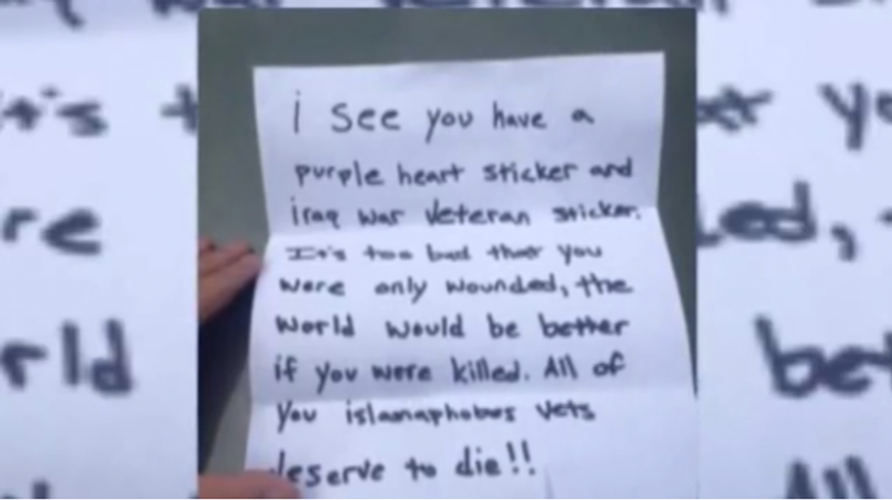 "I see you have a Purple Heart sticker and Iraq veteran sticker," the handwritten note read. "It's too bad that you were only wounded, the world would be better if you were killed. All of you Islamaphobes vets deserve to die!"