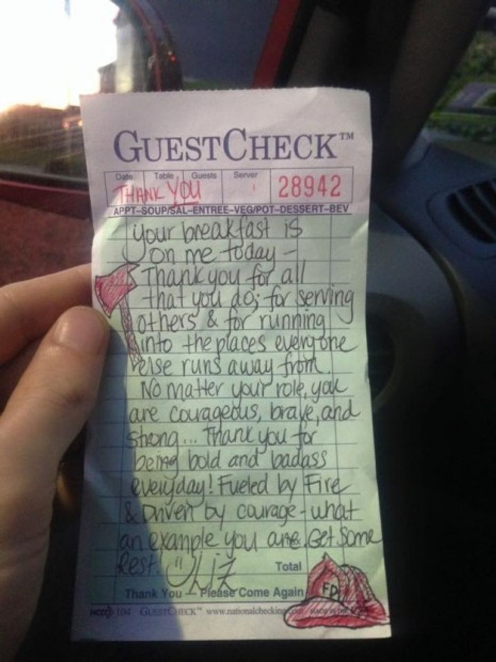 It read, “Your breakfast is on me today — Thank you for all that you do; for serving others & for running into the places everyone else runs away from. No matter your role, you are courageous, brave, and strong… Thank you for being bold and badass everyday! Fueled by fire and driven by courage — what an example you are. Get some rest.”