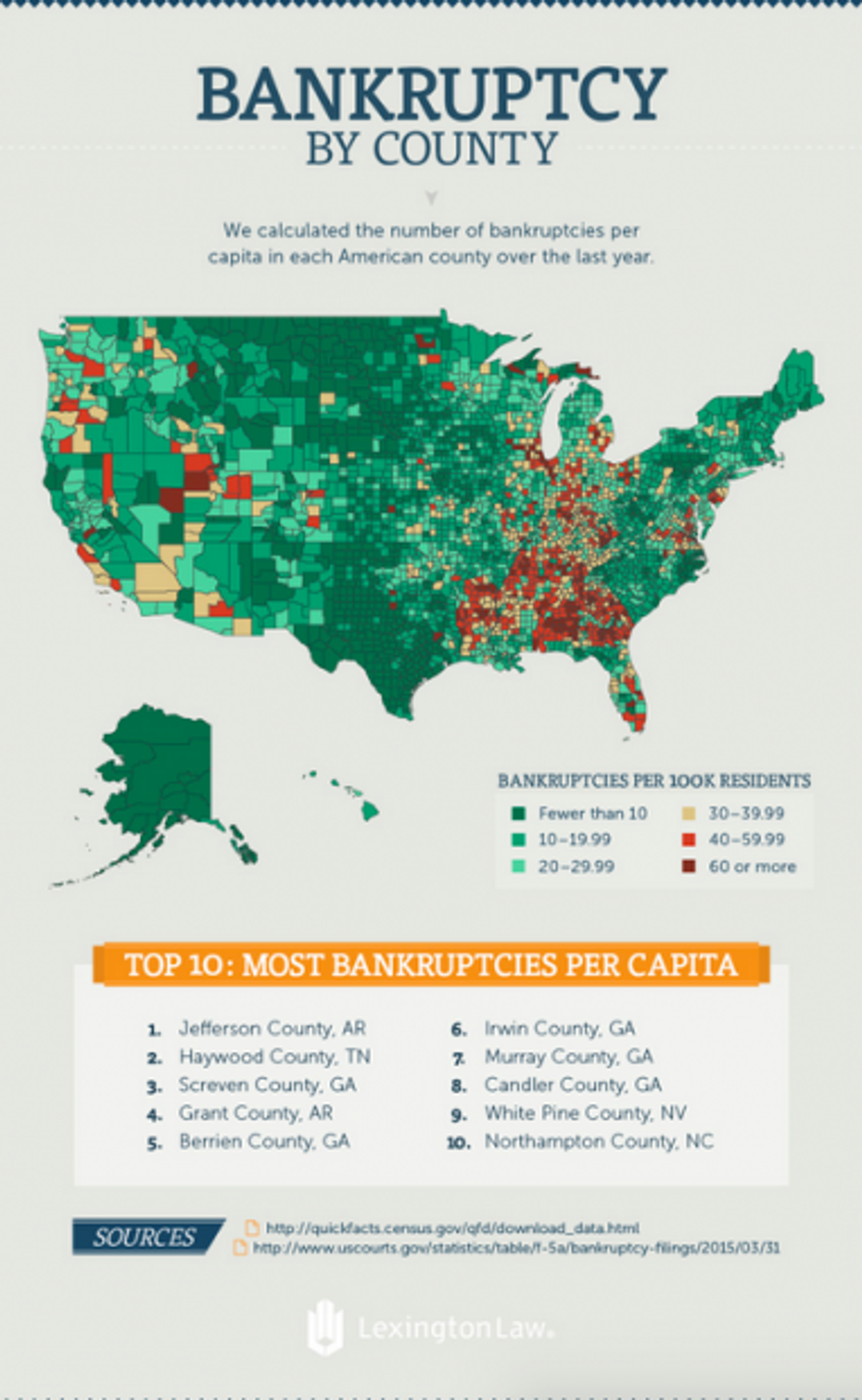 Lexington Law, a firm that bills itself as the leading credit repair firm, has compiled an interactive project that reveals the per capita rate of bankruptcy in every American county and state. The firm found that while some counties and states mired in bankruptcies also had high poverty rates, not every county or state did.