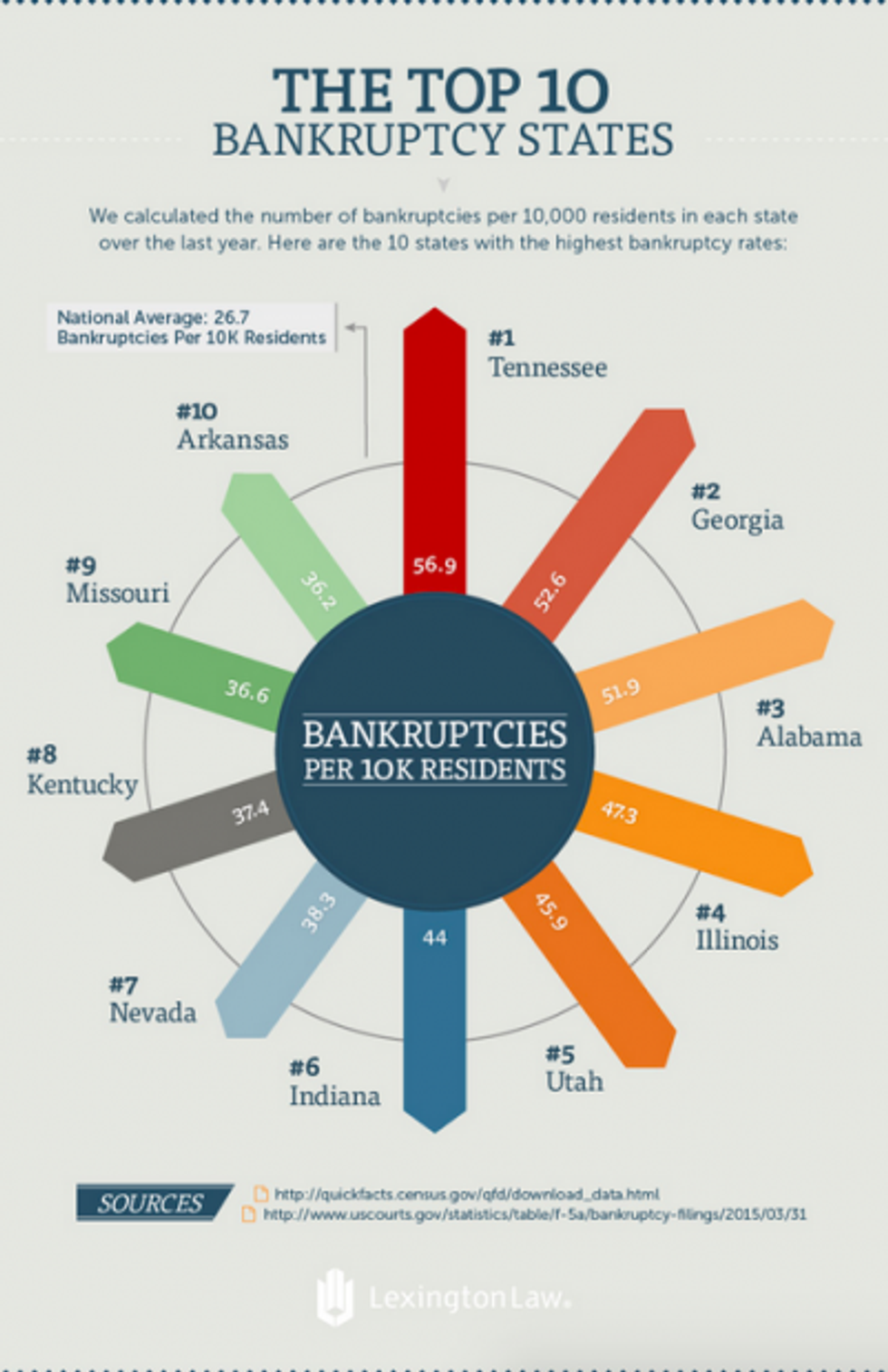 According to the law firm, all but two of the top 10 bankrupt counties are in Arkansas, Georgia or Tennessee. The states with the most bankruptcies per capita are: Tennessee, Georgia, Alabama, Illinois and Utah.