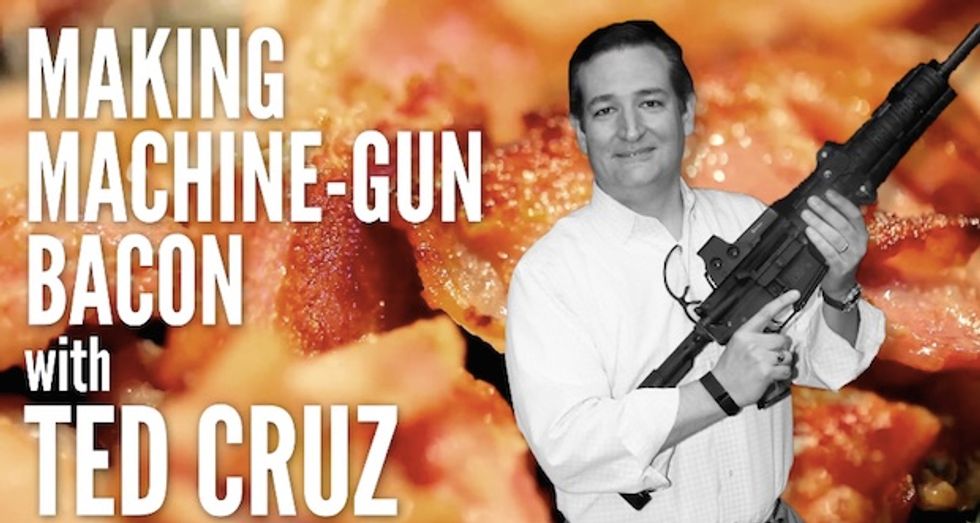 In the video for IJ Review, Cruz declares: "In Texas, we cook bacon a little differently than most folks." The barrel of a rifle is then wrapped with bacon, and the Texas senator fires until the heat off the weapon cooks the meat. His pronouncement at the end: "Mmmh. Machine gun bacon."