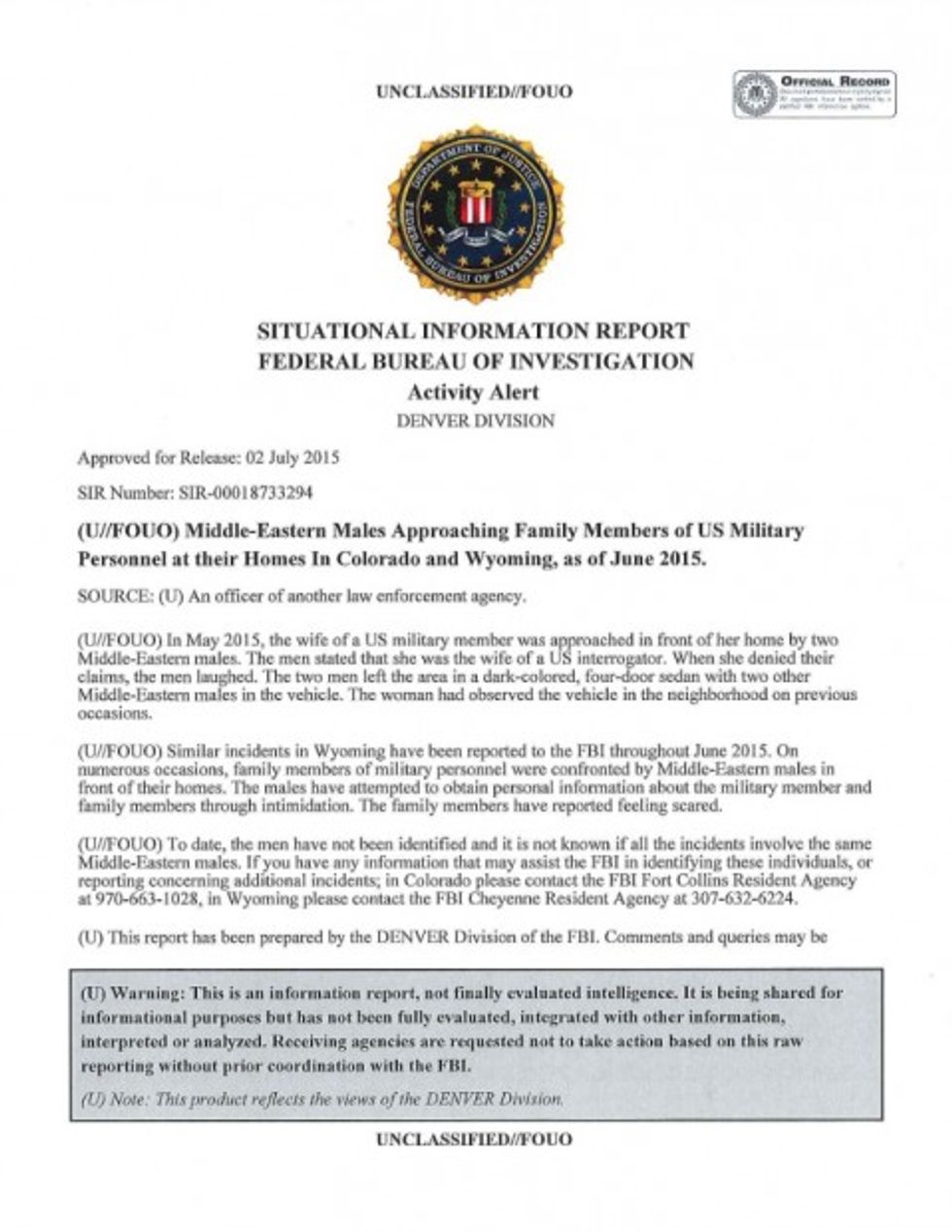 The Denver division of the FBI issued an alert to law enforcement in Colorado and Wyoming over suspicious behavior from "Middle-Eastern males" who have approached families members of military personnel in recent weeks.