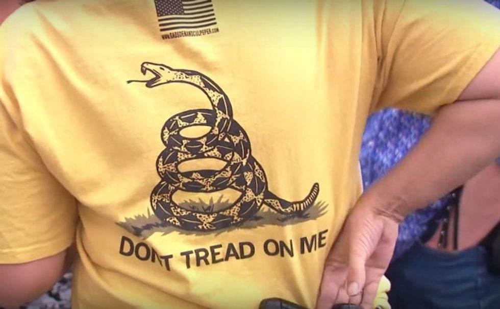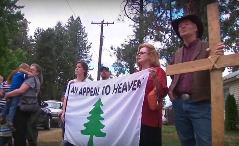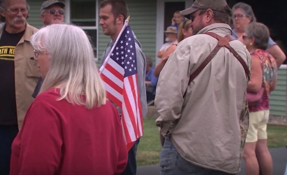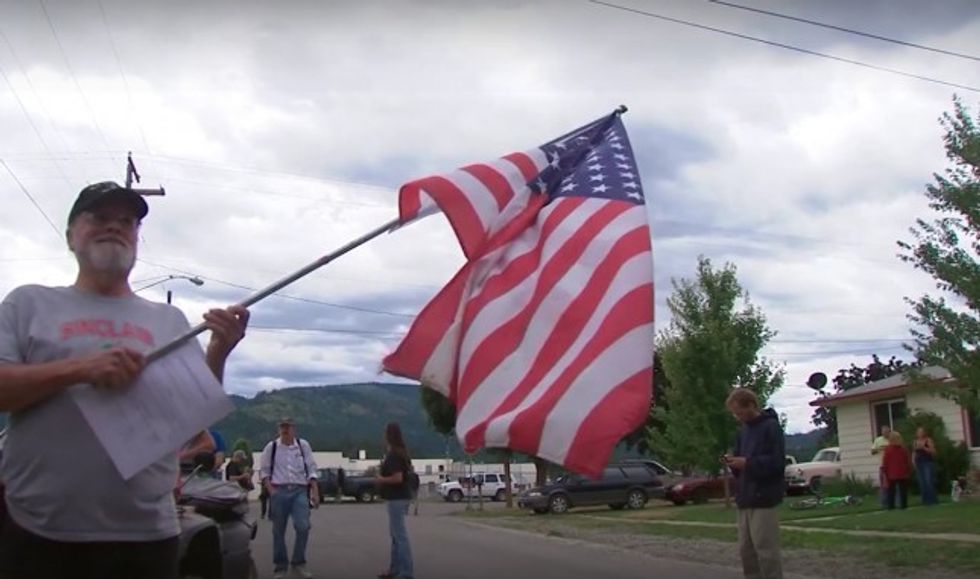 During Thursday's demonstration, the group at times broke out in song to sing "God Bless America" and pray while waving both the American flag and the "Don't tread on me" flag. With a population of just 1,700, Priest River is near the tip of northern Idaho — a region known for its strong Tea Party roots and gun-rights activism.