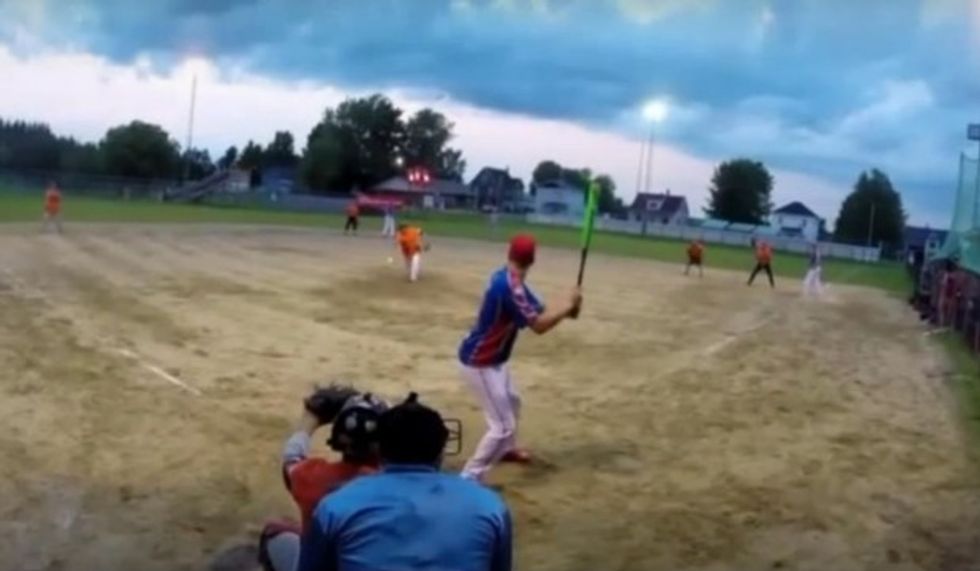 As you can see in the video, as the baseball crosses the plate, Lefort suddenly turns around and swings the bat. The softball is launched high into the air and all the way out of the park.