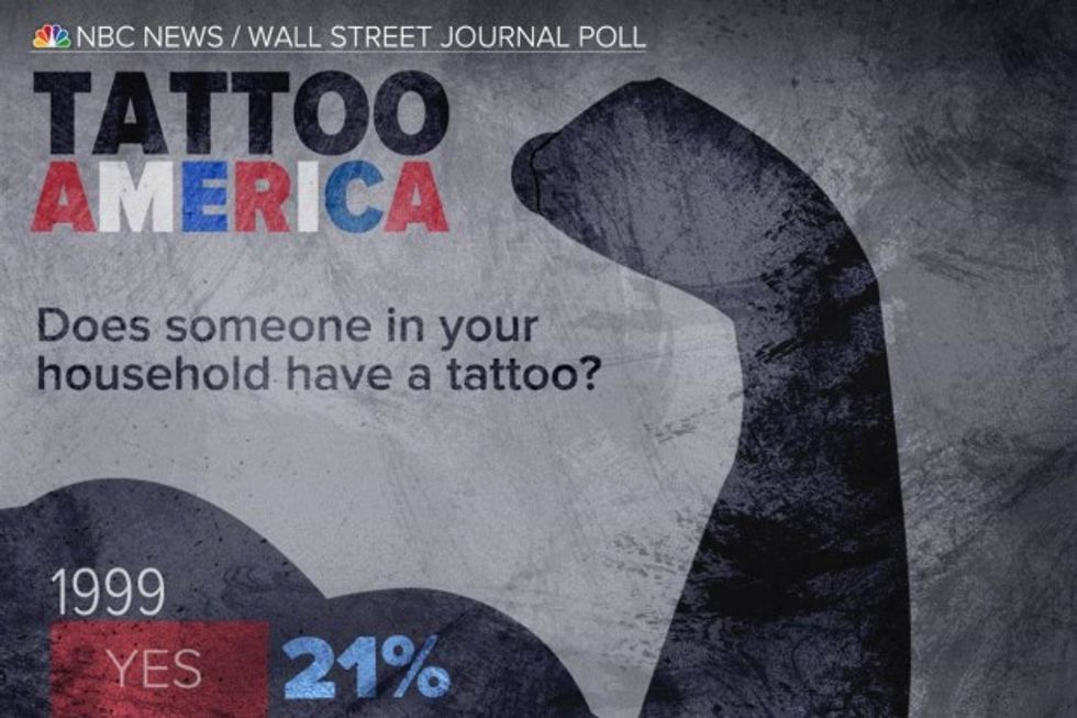 According to a 2014 NBC News / Wall Street Journal poll, 40 percent of households in America reported at least one person with a tattoo. Looking back to 1999, 21 percent of households had a person with a tattoo. The number doubled in just five years.
