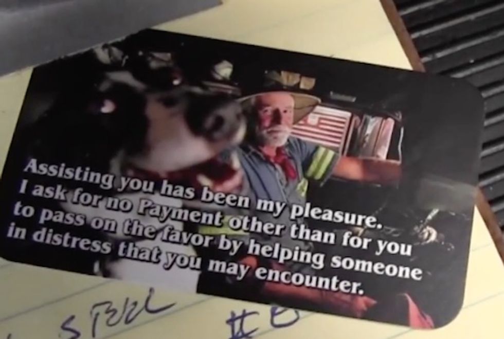 Instead, he hands them a card reading, "Assisting you has been my pleasure. I ask for no payment other than for you to pass on the favor by helping someone in distress that you may encounter."
