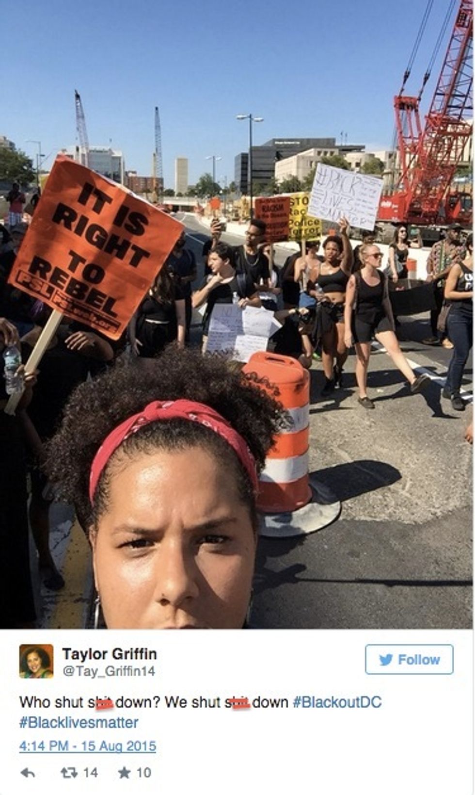 — Taylor Griffin (@Tay_Griffin14) August 15, 2015Shutting down the highway. #BlackoutDC # blacklivesmatter pic.twitter.com/wEYreKrl5Y
