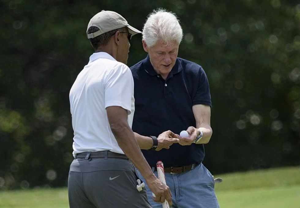 President Barack Obama (left) hands former President Bill Clinton a ball while golfing at Farm Neck Golf Club, August 15, 2015, in Oak Bluffs, Massachusetts on Martha's Vineyard. (Image source: BRENDAN SMIALOWSKI/AFP/Getty Images)