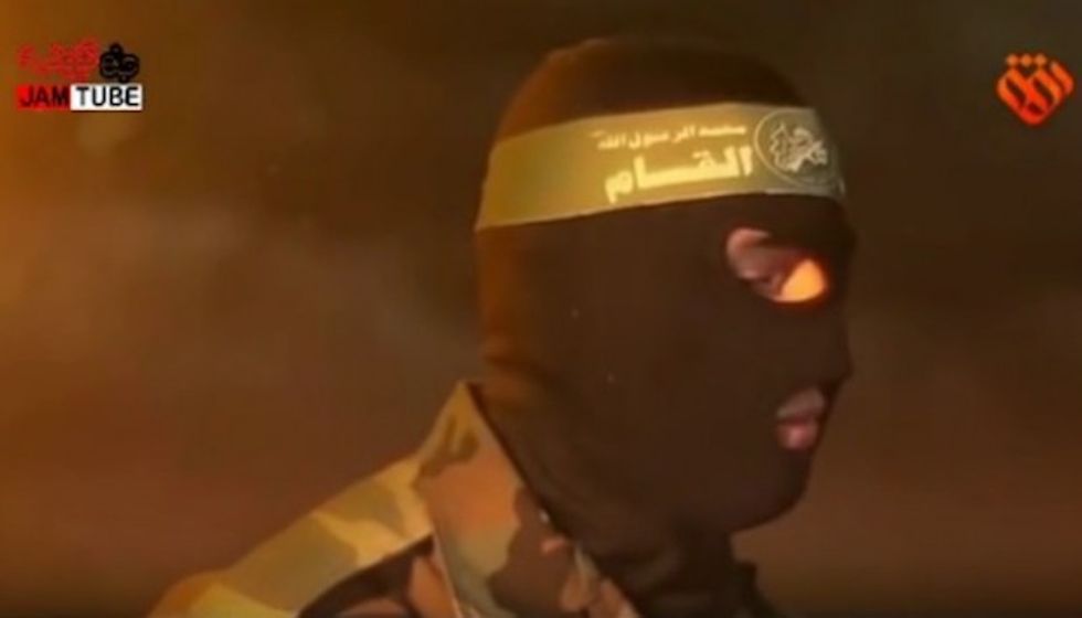 The Algemeiner detailed the lineup of fighters portrayed in the video which, according to the Investigative Project, was produced by the Islamic Revolution Design House: “One dons the IRGC [Revolutionary Guards] insignia on his left arm, another the emblem of the Iran-backed Iraqi Shia Badr Organization. Yet a third dons a headband bearing the Lebanese Hezbollah logo, and a fourth is seen clad in Hamas’ characteristic balaclava and the Qassam Brigades green headband.”
