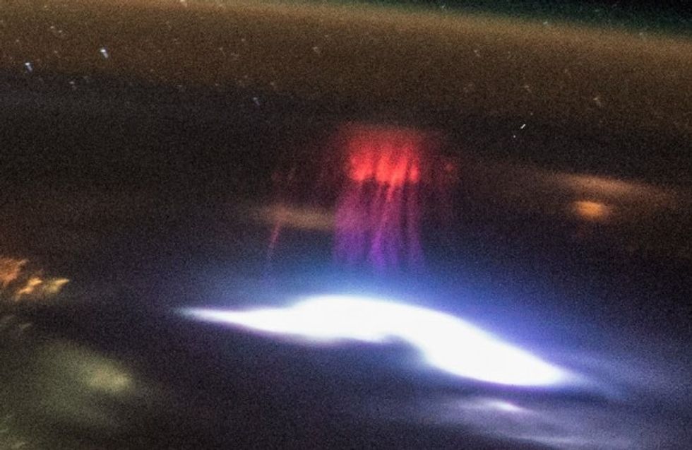 The image taken from the ISS on August 10 at an altitude of 216 nautical miles shows the jellyfish-like tendrils that NASA describes as "electrical discharges can extend 20 to 30 kilometers up into the atmosphere and are connected to thunderstorms and lightning."