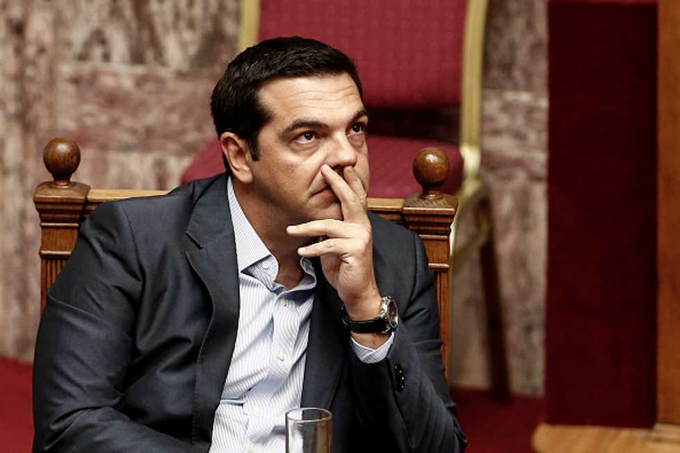 Alexis Tsipras, Greece's prime minister, pauses during a parliamentary session ahead of a vote by lawmakers on a bailout deal in Athens, Greece, on Friday, Aug. 14, 2015. (Photographer: Yorgos Karahalis/Bloomberg via Getty Images)