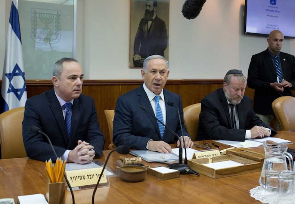 Israeli Prime Minister Benjamin Netanyahu talks to the press during the weekly cabinet meeting, sitting next to National Infrastructures, Energy and Water Minister Yuval Steinitz, left, in his Jerusalem office, April 19, 2015. (Menahem Kahana/AFP/Getty Images)