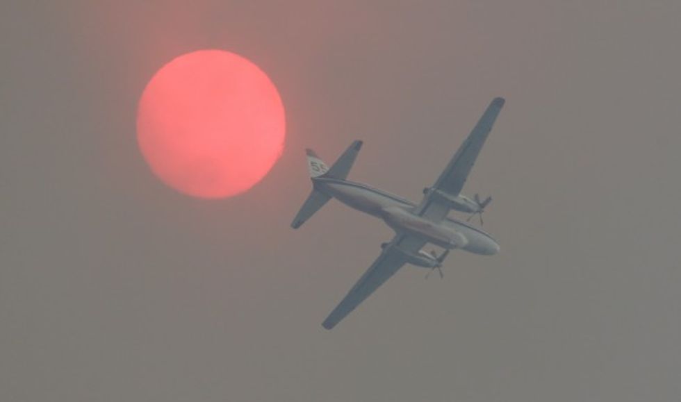 A fire-retardant airplane passes near the sun turned orange with smoke as a wildfire burns near Twisp, Wash. Wednesday, Aug. 19, 2015. (AP Photo/Ted S. Warren)