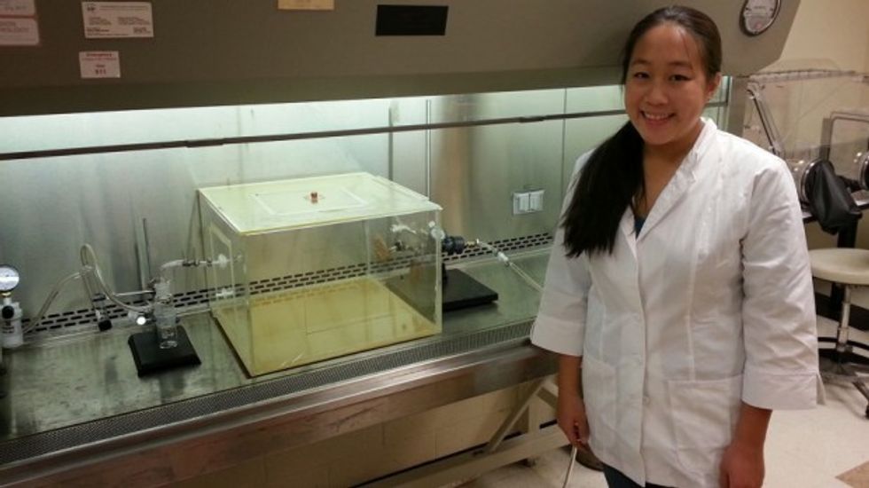 In a fume hood in NC State's NoroCORE lab is a box with a modeled head smaller than the size of a human hand. That head with an opened mouth is attached to a tube that shoots a virus-laced liquid into the box that has various sensors to take measurements of the simulated projectile vomit.
