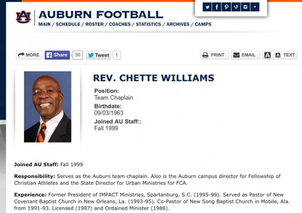 The Freedom From Religion Foundation, a group that regularly takes aim at perceived violations of the First Amendment, fired off a letter to Auburn University president Jay Gouge this week, claiming that chaplain Chette Williams' presence is entirely inappropriate.