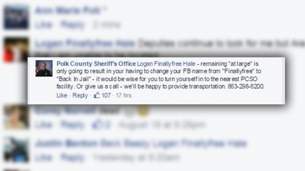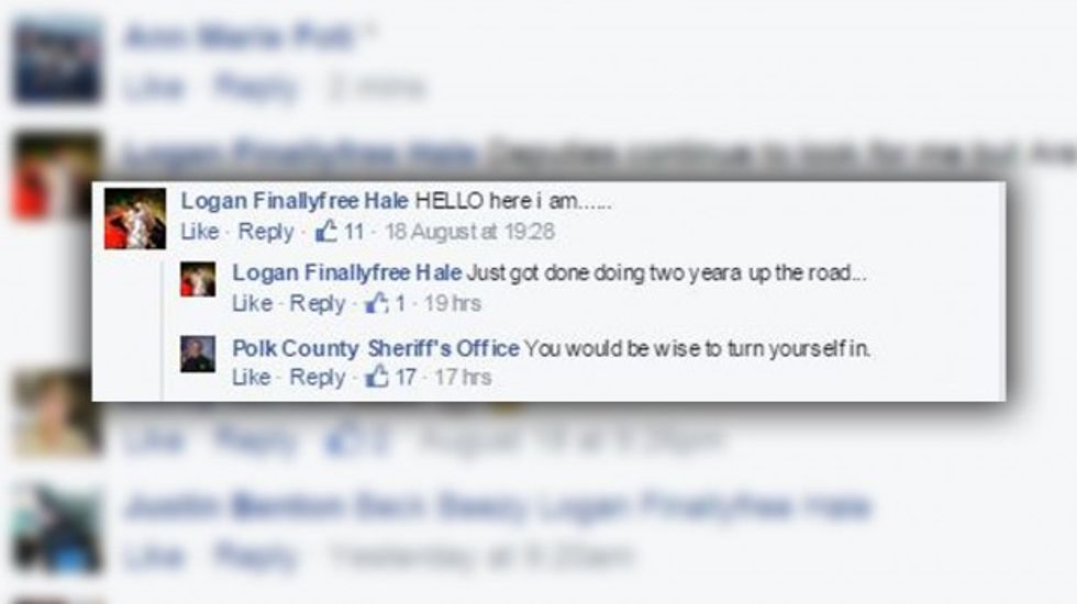 "Logan Finallyfree Hale - remaining 'at large' is only going to result in your having to change your FB name from 'Finallyfree' to 'Back In Jail' - it would be wise for you to turn yourself in to the nearest PCSO facility," someone posted from the Polk County Sheriff's Office page. "Or give us a call - we'll be happy to provide transportation."
