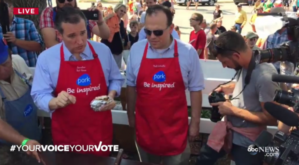 Page, wearing sunglasses and a hat, reportedly snuck up on Cruz as he was grilling pork chops at the fair.