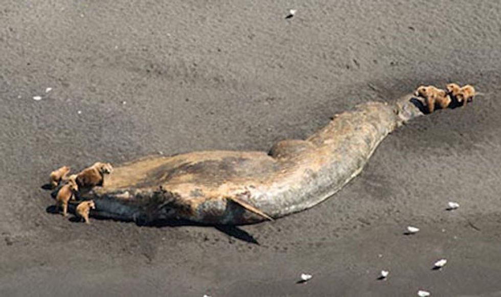 Bears feeding on a fin whale carcass in Larson Bay, Alaska. (Image source: NOAA)