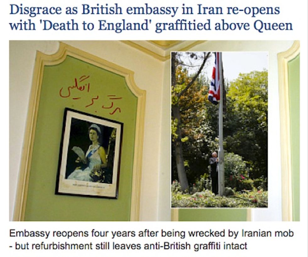 British Foreign Secretary Philip Hammond was in Tehran Sunday for a ceremony reopening the U.K.’s embassy to Iran, but British media appeared to be surprised that offensive graffiti scrawled on the walls four years ago calling for “Death to England” had not been removed.