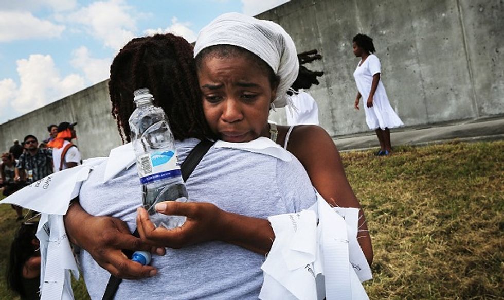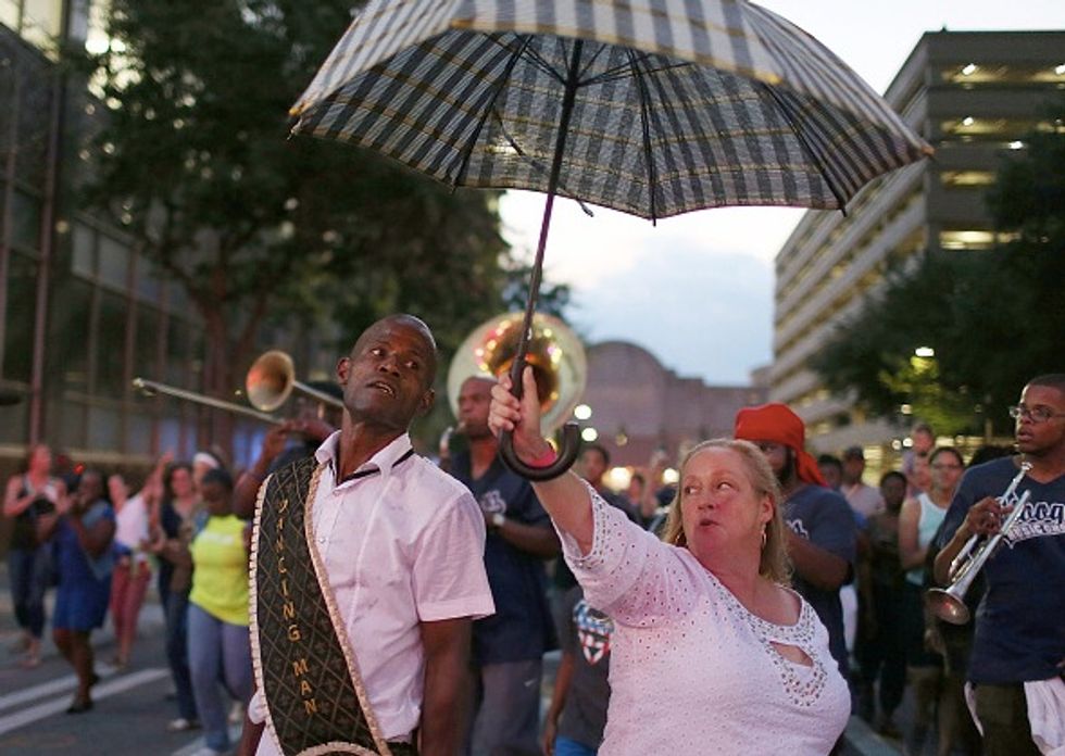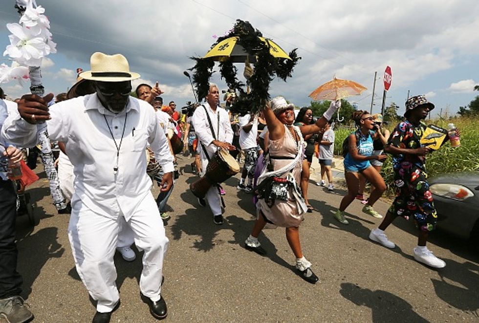 People march through the Lower Ninth Ward during a second line parade on the 10th anniversary of Hurricane Katrina on August 29, 2015 in New Orleans, Louisiana. (Mario Tama/Getty Images)