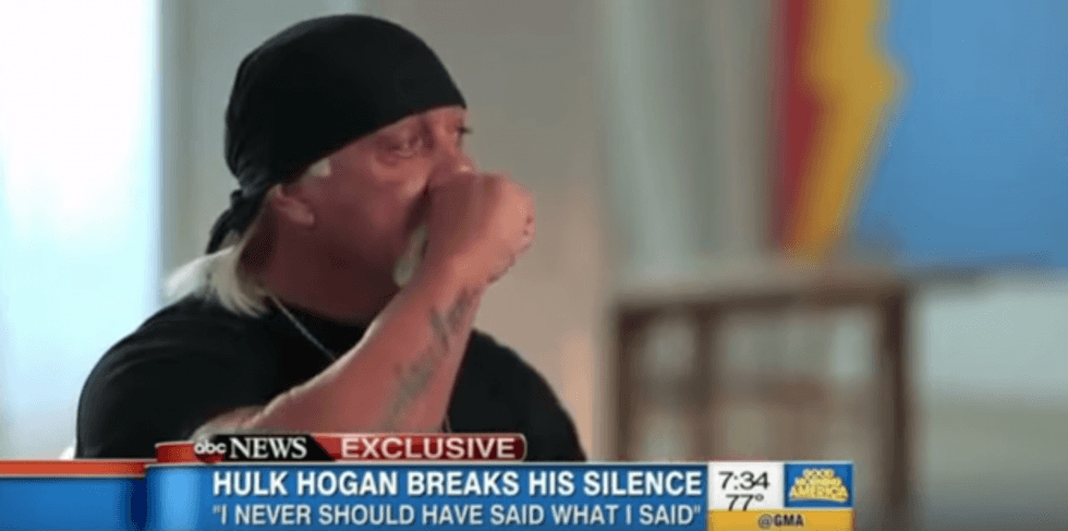 "Oh, my gosh. Please forgive me. Please forgive me," Hogan said. "I think if you look at the whole picture of who Hulk Hogan is, you can see over all the years that there's not a racist bone in my body."