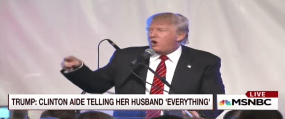 “So, Huma is getting classified secrets, she’s married to Anthony Weiner, who’s a perv,” Trump said over the weekend. “He is! … So, she’s married to a bad guy…Do you think there’s even a 5 percent chance she’s not telling Anthony Weiner, now of a public relations firm, what the hell is coming across? Do you think there’s even a little bit of a chance? I don’t think so.”
