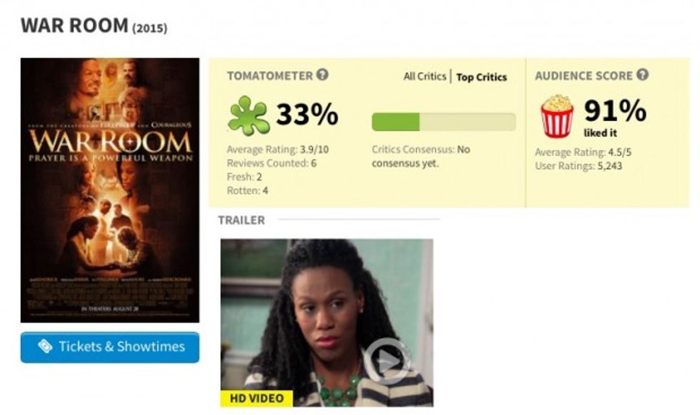 While a rousing 91 percent of the more than 5,200 audience members liked "War Room" on Rotten Tomatoes, it received only a 33 percent favorability rating among the six top critics who reviewed it; that latter proportion decreased to 25 percent when accounting for all reviewers.