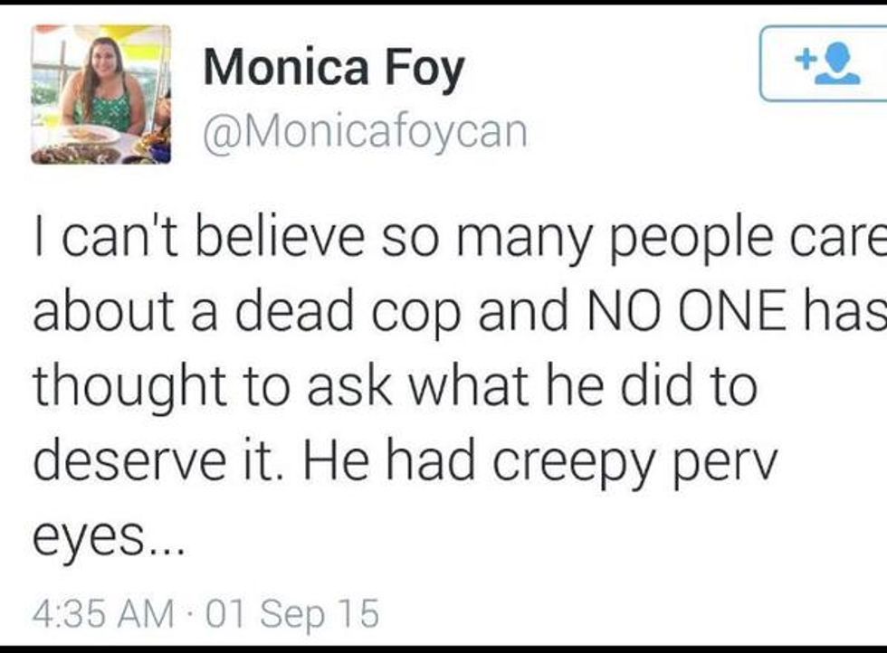 The student, Monica Foy, suggested in a Twitter post early Tuesday that perhaps Goforth did something to deserve being brutally executed while pumping gas in uniform. She accused the slain officer of having “creepy perv eyes” and later tweeted support for #BlackLivesMatter.