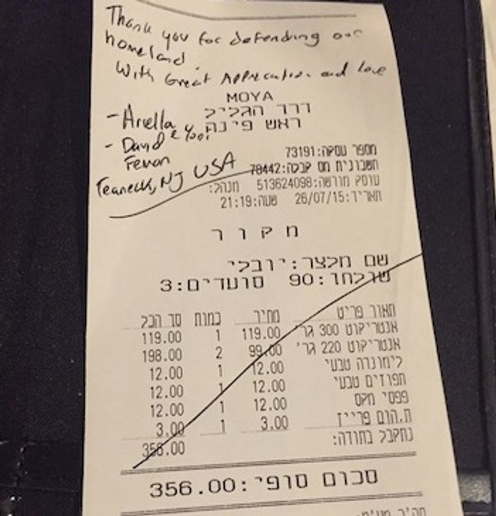 The solder sent a photo of the bill to the website Humans of Judaism, which posted the picture. On top of the 356 shekel bill — about $90 before tip — was a handwritten thank-you note.