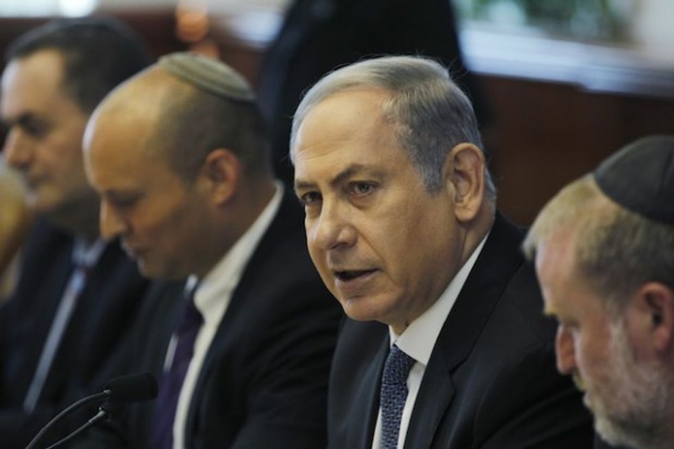 Israel's Prime Minister Benjamin Netanyahu attends the weekly cabinet meeting at his office in Jerusalem on Monday, Aug. 31, 2015. (Ronen Zvulun/Pool photo via AP)