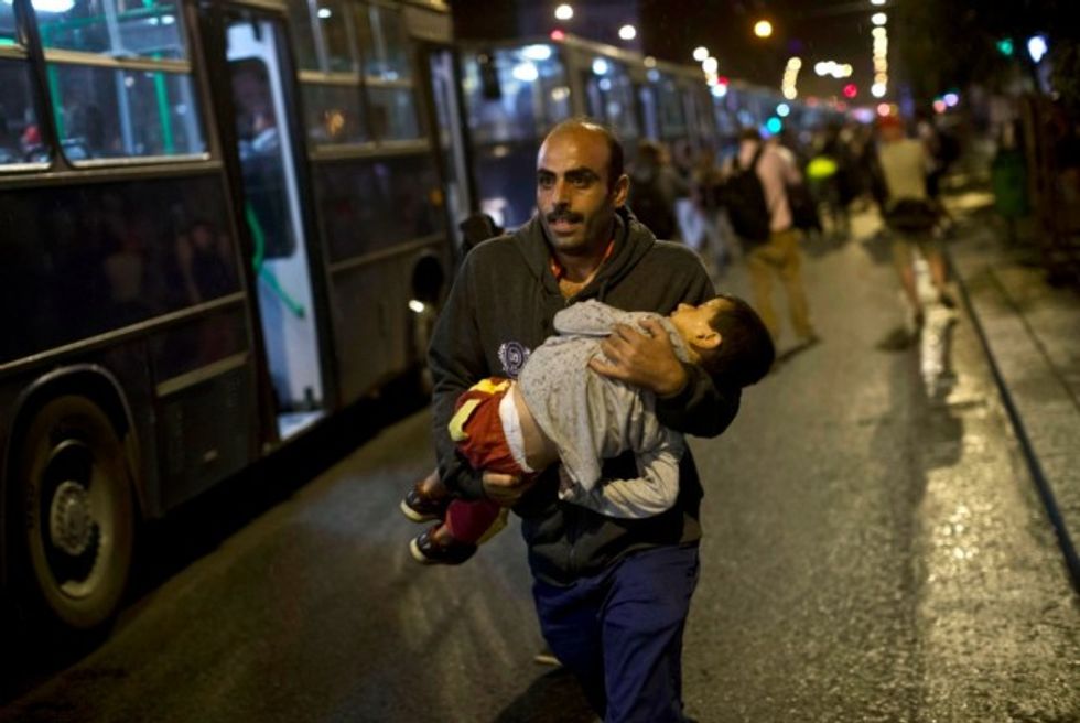 A man runs with child in arms as he tries to board a bus provided by Hungarian authorities for migrants and refugees at Keleti train station in Budapest, Hungary, Saturday, Sept. 5, 2015. (AP Photo/Marko Drobnjakovic)