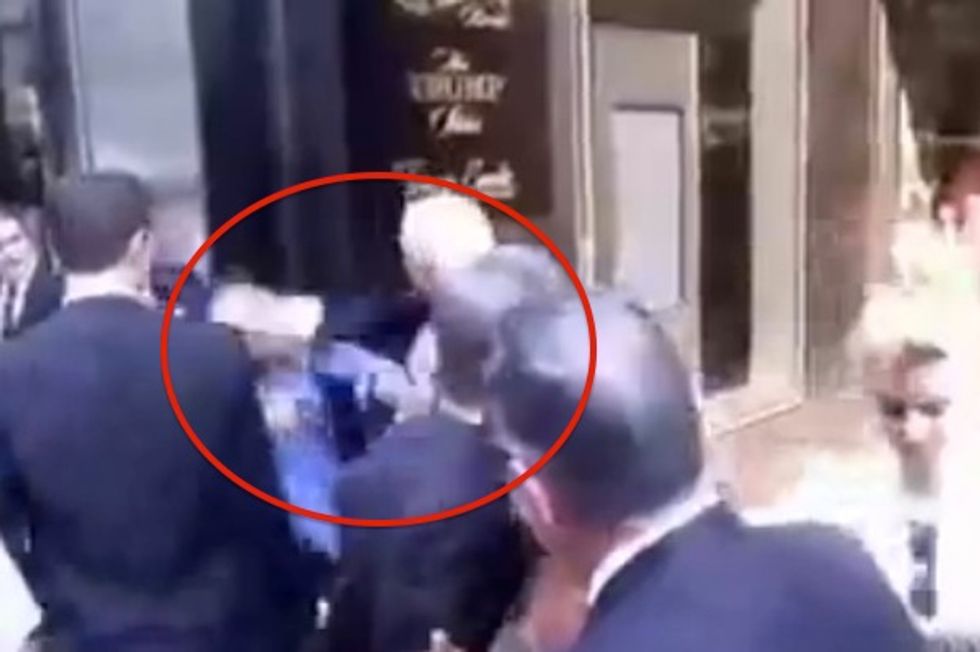 A protester outside Trump Tower in New York City Thursday appeared to be punched by a security guard who had been carrying away a sign.