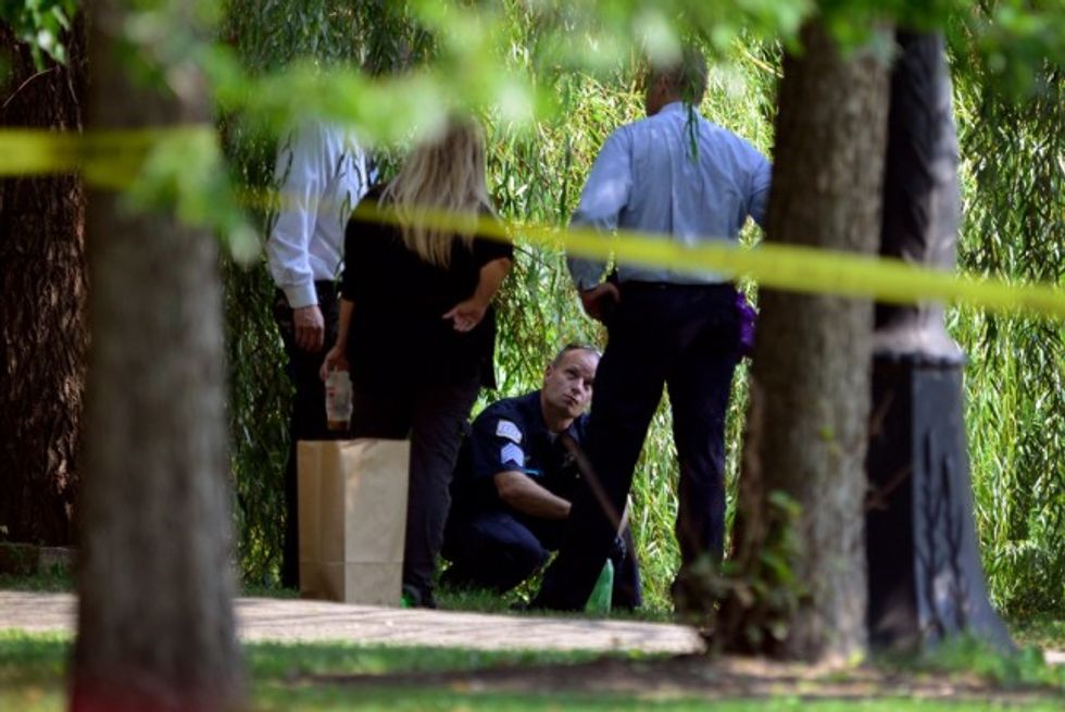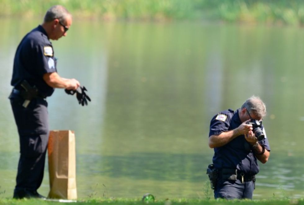 Chicago Police investigators collect evidence while searching a lagoon at Garfield Park, Sunday, Sept. 6, 2015, in Chicago, after a toddler's decomposed feet and hand were found on Saturday. (AP Photo/Paul Beaty)