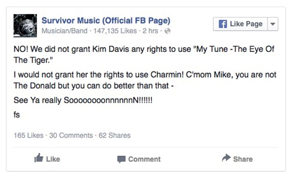 Writing on the Survivor's official Facebook page, songwriter Frankie Sullivan said the band had not given Davis the rights to use the song.