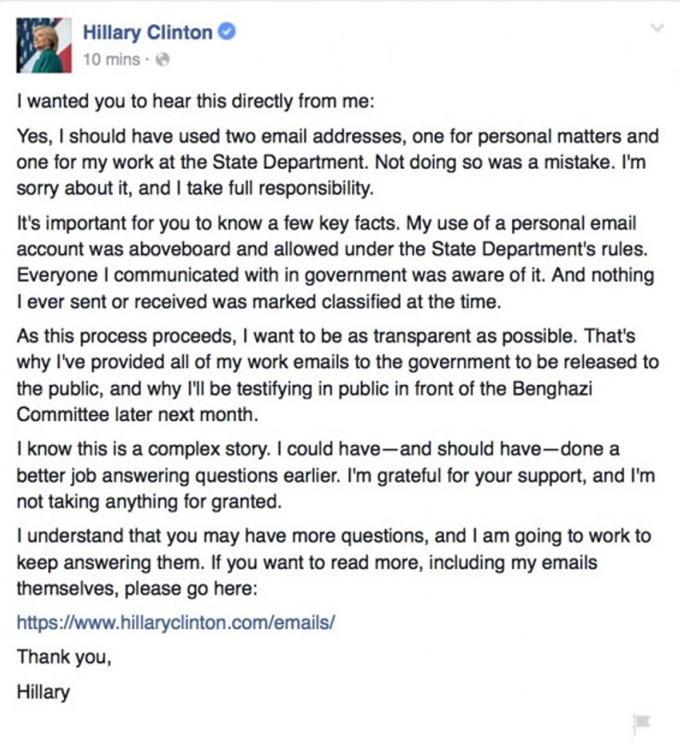 I'm Sorry': Read the Apology Hillary Clinton Just Posted to Facebook for Using Private Email Server