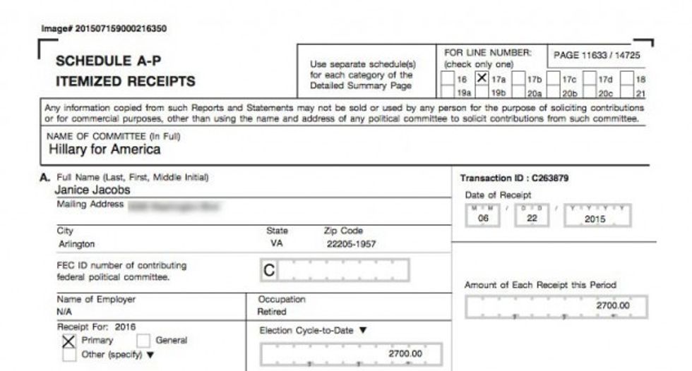 Janice Jacobs made a $2,700 contribution to Clinton's campaign on June 22, an FEC document shows.