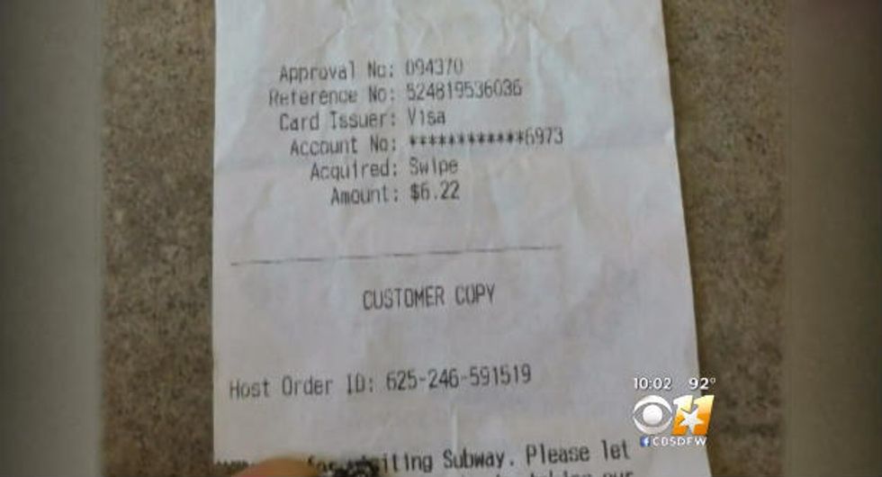 But the family found something in their backyard that's giving them a sense of vindication. The burglars apparently went to Subway for a sandwich to distract the dogs while they stole the items, and left the receipt that shows a limited amount of credit card information.