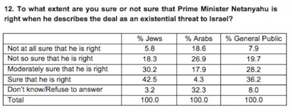 The survey, published Wednesday by the Israel Democracy Institute and Tel Aviv University, found that 73 percent of Israeli Jews said they were "sure" or at least "moderately sure" that Prime Minister Benjamin Netanyahu is right when he says the deal poses an existential threat to the country.
