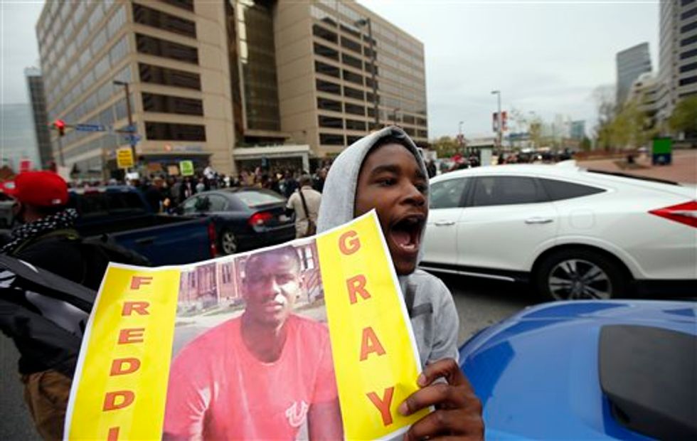 Marchers block the Pratt Street after a march to City Hall for Freddie Gray, Saturday, April 25, 2015 in Baltimore. (AP Photo/Alex Brandon)