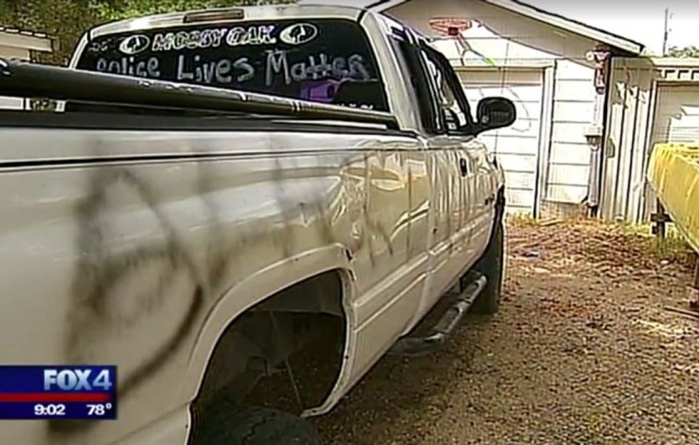 The Lattin family is getting by with a rental car for now, but KDFW reported that their plan — even if it means covering over the hateful graffiti with white spray paint — is to get their truck decorated with support for police back on the road.