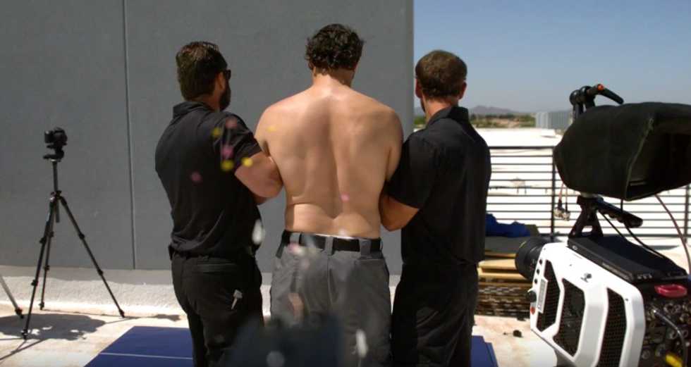When slowed down, the muscles in the man's back could be seen contracting from right to left after the point of impact.