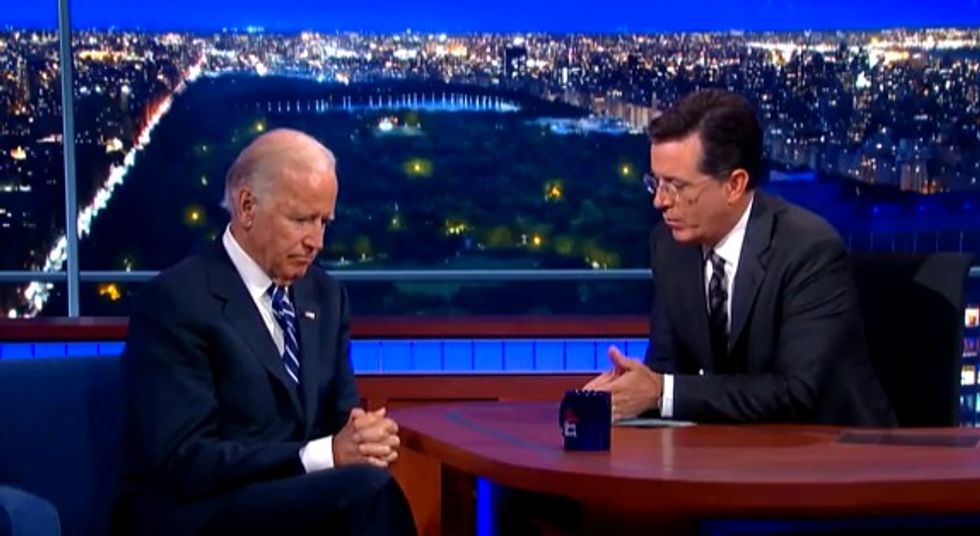 There were a few laughs shared between Vice President Joe Biden and Stephen Colbert, but much of the interview struck an emotional tone. (Image source: YouTube)