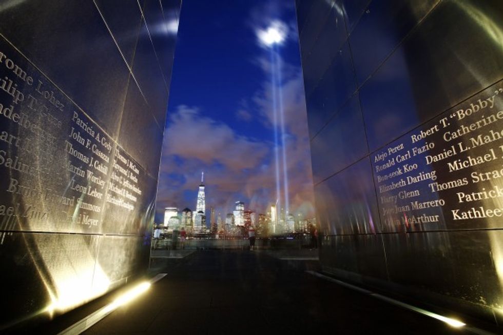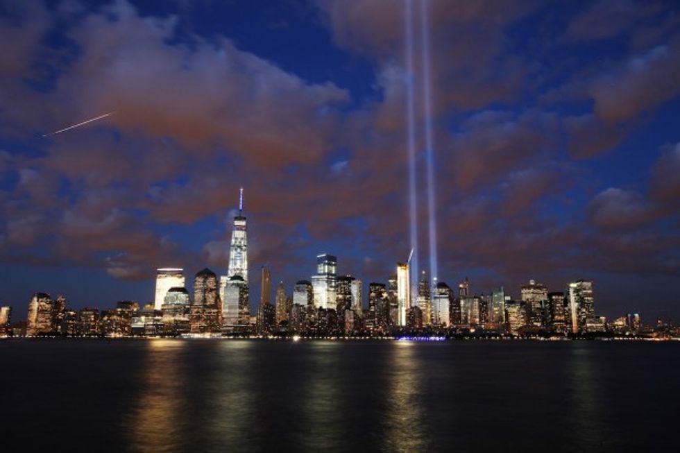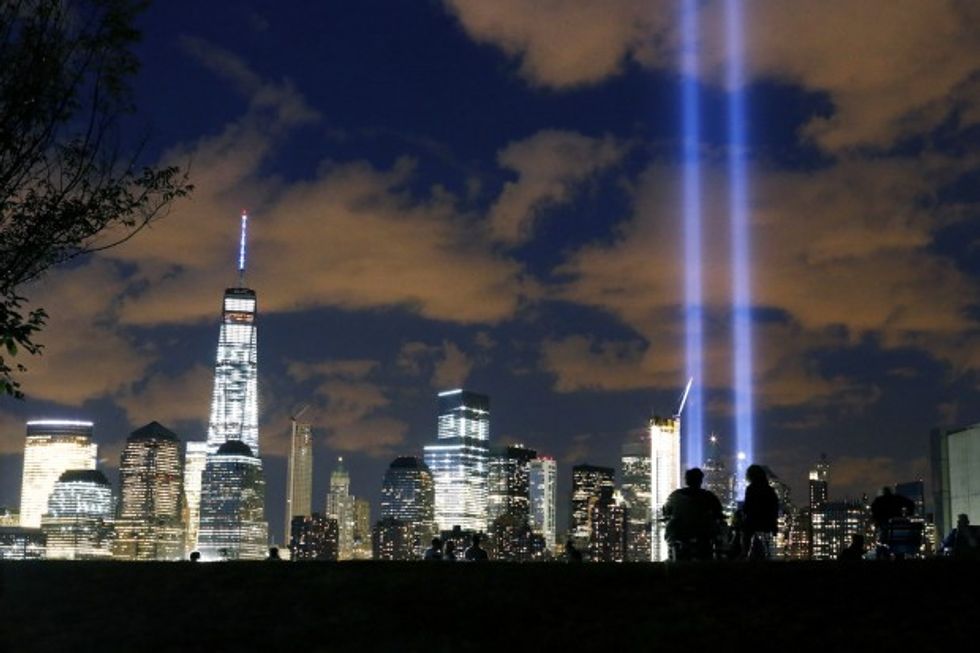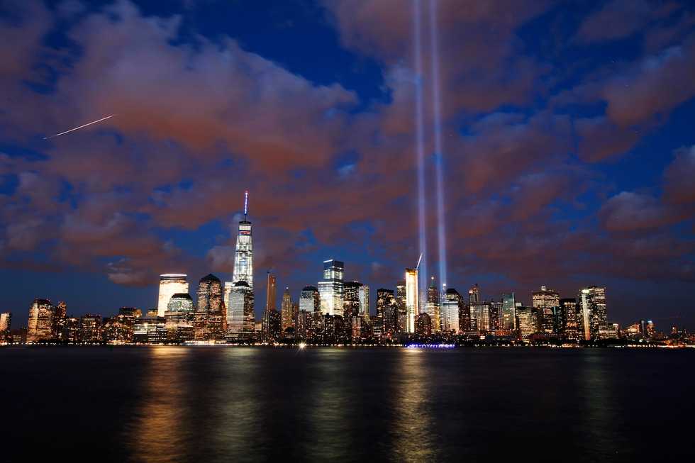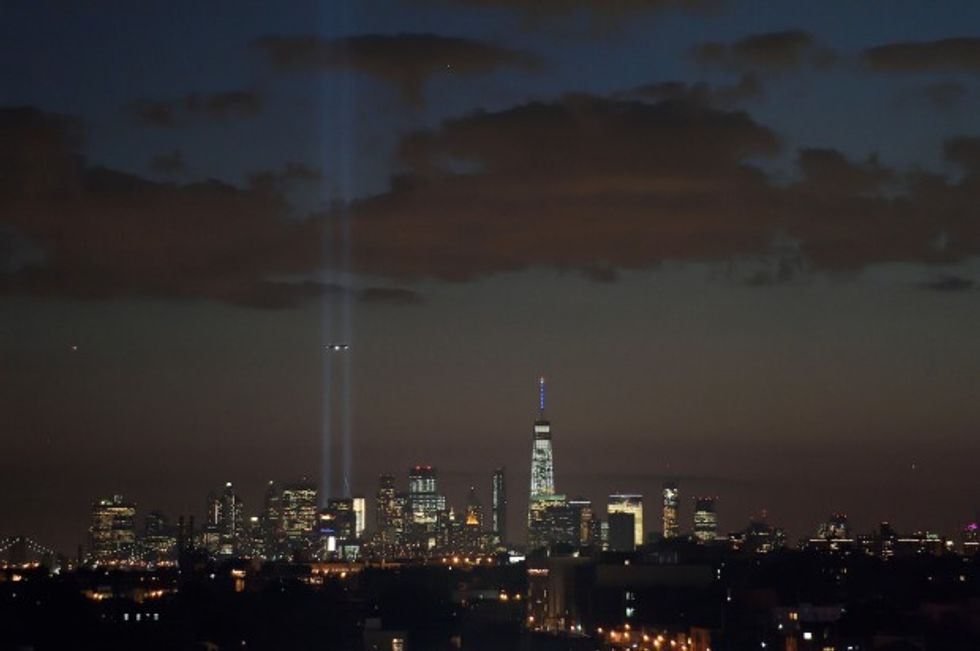 Officials powered on nearly 100 7,000-watt xenon bulbs to illuminate two beams into the sky marking the spot where the Twin Towers once stood.