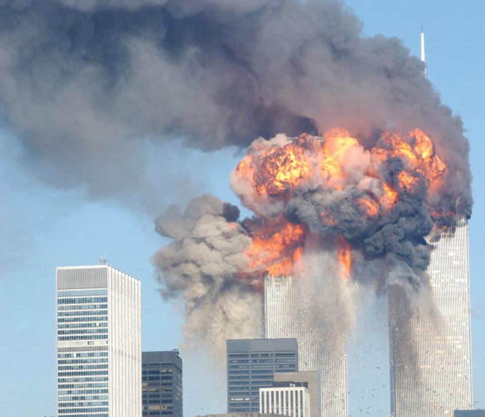 A fiery blasts rocks the World Trade Center after being hit by two planes September 11, 2001 in New York City. (Spencer Platt/Getty Images)