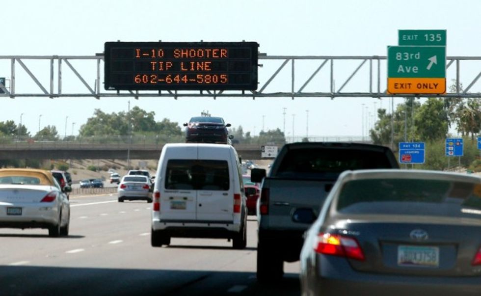 A sign still displays a shooter tip line above Interstate 10, Friday, Sept. 11, 2015, in Phoenix. (AP Photo/Ross D. Franklin)