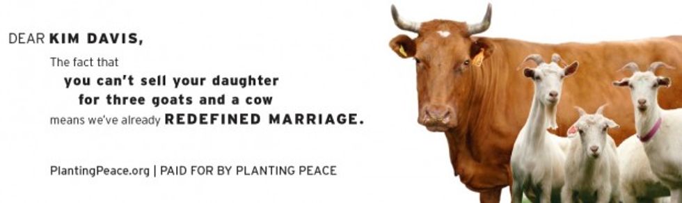 Paid for by gay rights and humanitarian group Planting Peace, the message — which cost $500 and will remain up for one month — features pictures of goats and a cow and reads, "Dear Kim Davis, The fact that you can't sell your daughter for three goats and a cow means we've already redefined marriage."