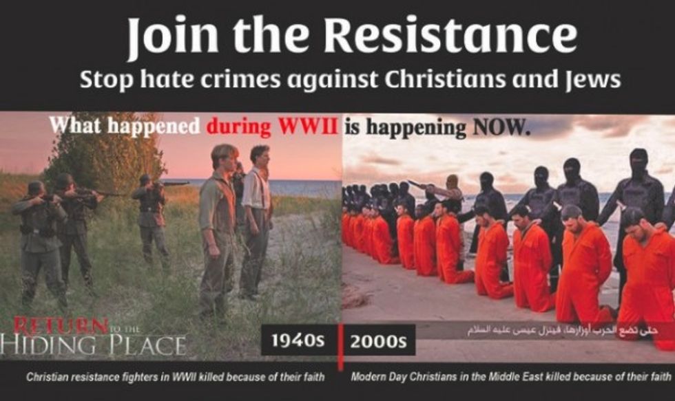 "We are working with denominations across the country to schedule screenings of our film followed by a panel discussing the terrifying parallels between Nazi Germany's extermination of the Jews and the current hate-onslaught of [the Islamic State] and their mission to liquidate Christians, starting in the Middle East," he said. "Groups won't even need to sell tickets to the event."