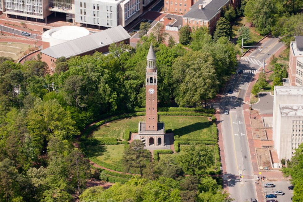 CHAPEL HILL, NC - APRIL 21: An aerial view of the University of North Carolina campus including the Morehead-Patterson Bell Tower (center) on April 21, 2013 in Chapel Hill, North Carolina. (Photo by Lance King/Getty Images)