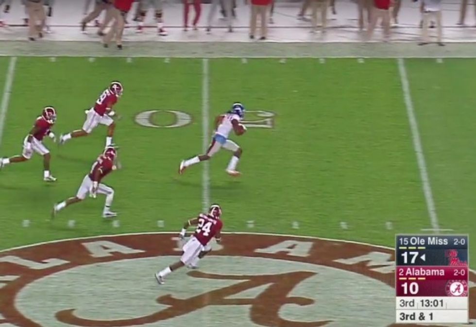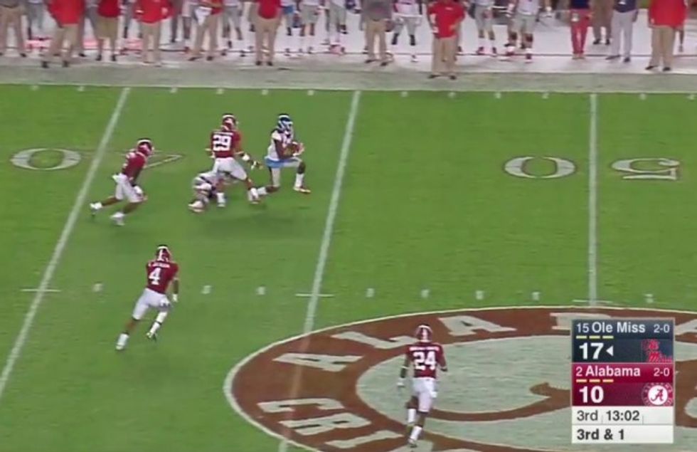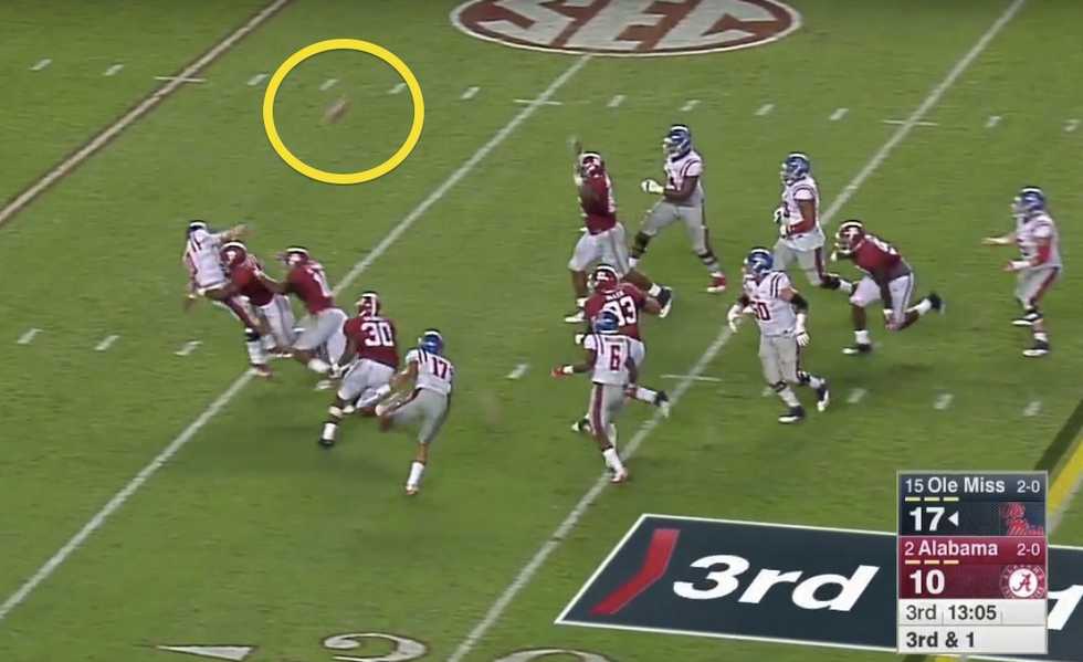 While Ole Miss quarterback Chad Kelly was able to snatch the errant pigskin, Alabama defenders had already converged upon him for a sack.