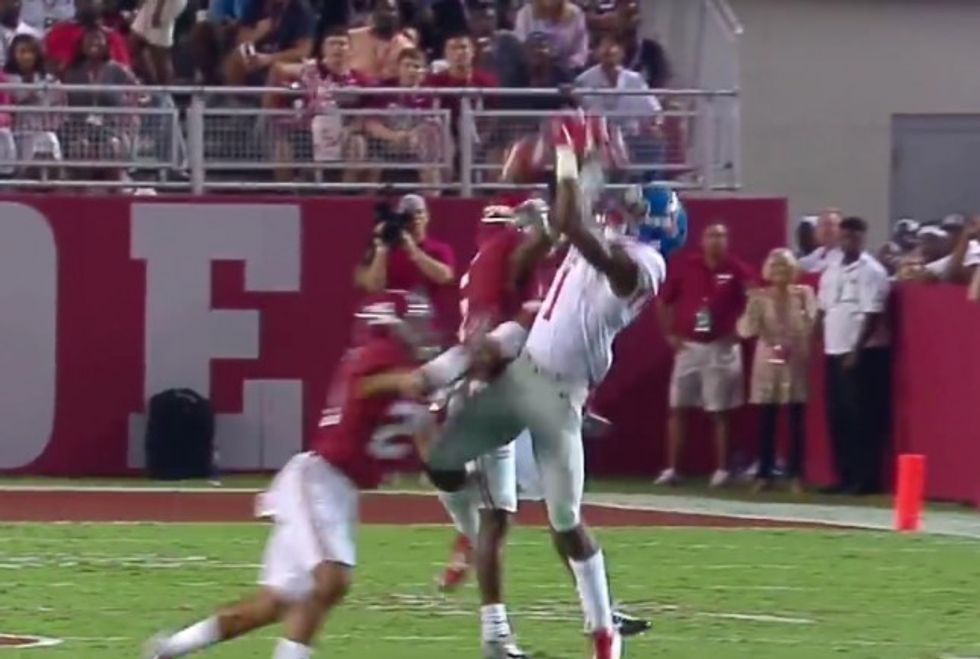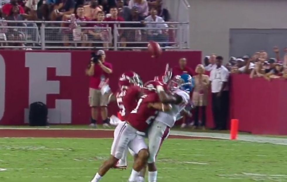 Then it bounced off one of the two Alabama defensive backs covering him: